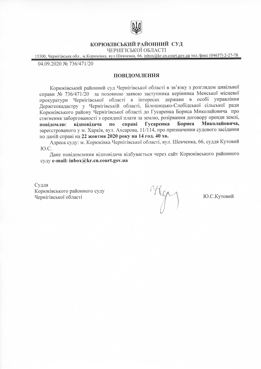 Повідомлення від 04.09.2020 про виклик до суду Гусаренка Бориса Миколайовича