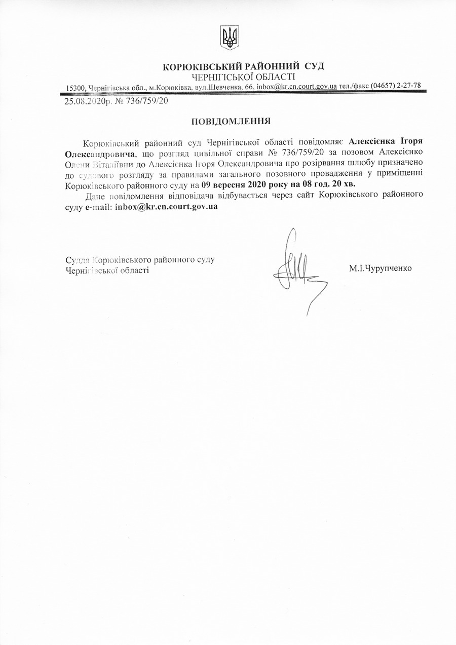 Повідомлення від 25.08.2020 про виклик до суду Алексієнка Ігоря Олександровича