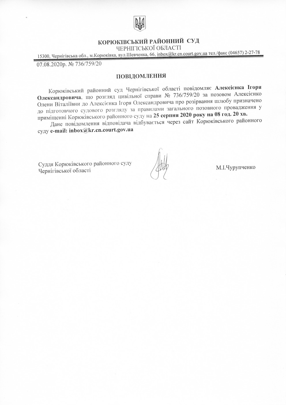 Повідомлення від 07.08.2020 про виклик до суду Алексієнка Ігоря Олександровича