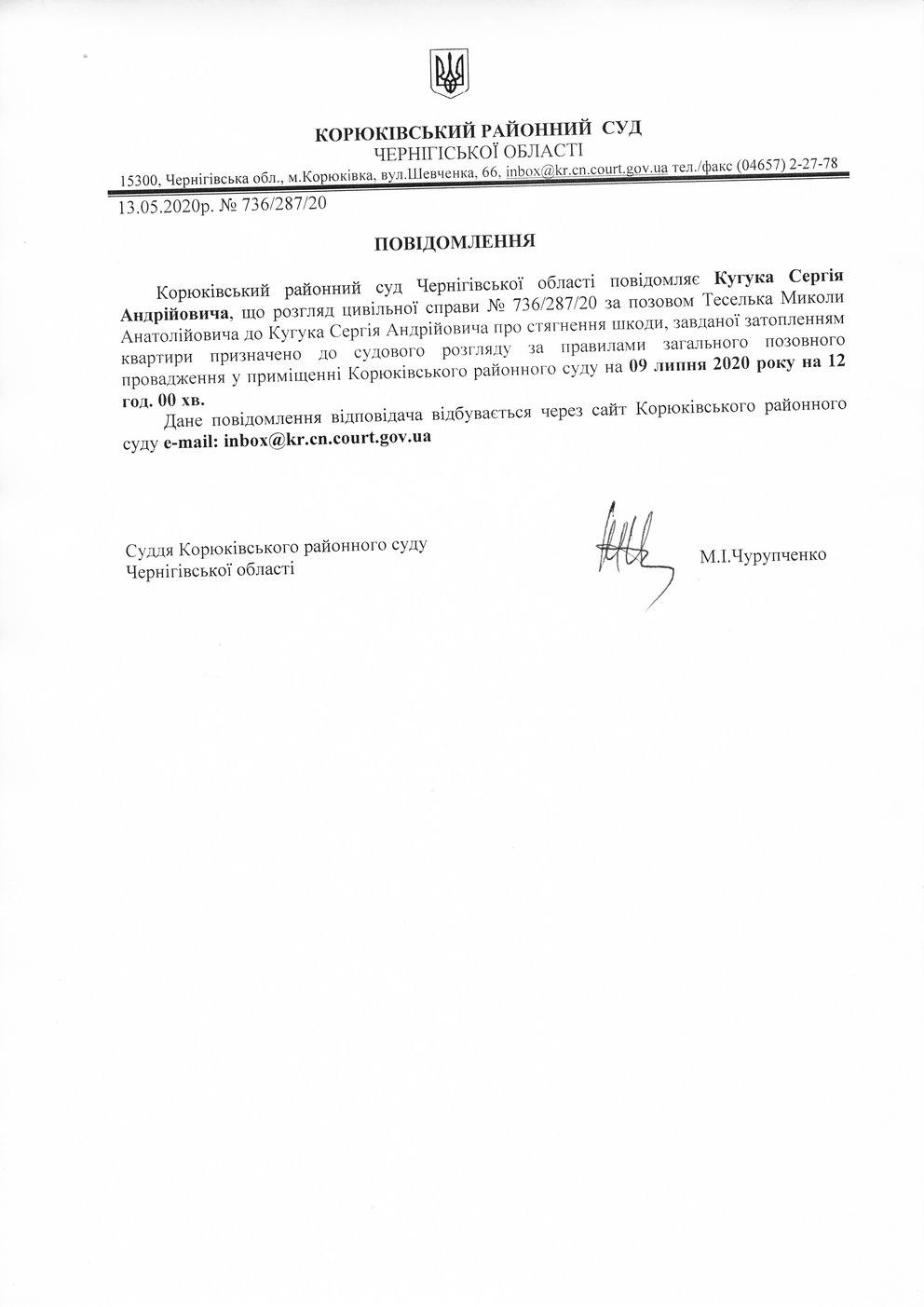Повідомлення від 13.05.2020 про виклик до суду Кугука Сергія Андрійовича