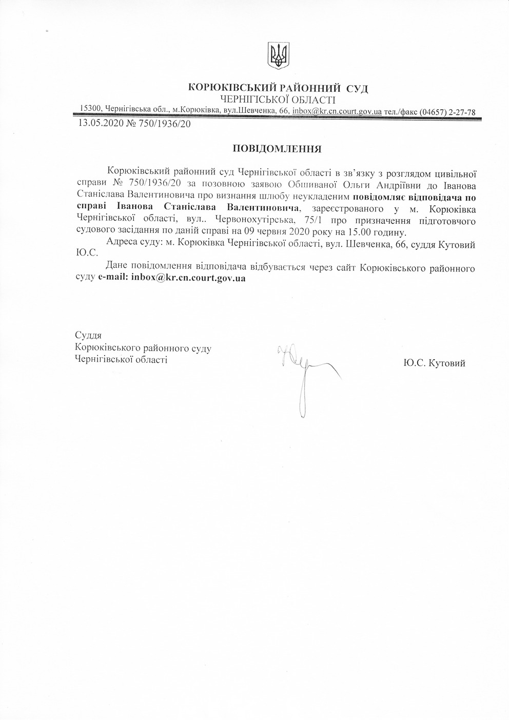 Повідомлення від 13.05.2020 про виклик до суду Іванова Станіслава Валентиновича