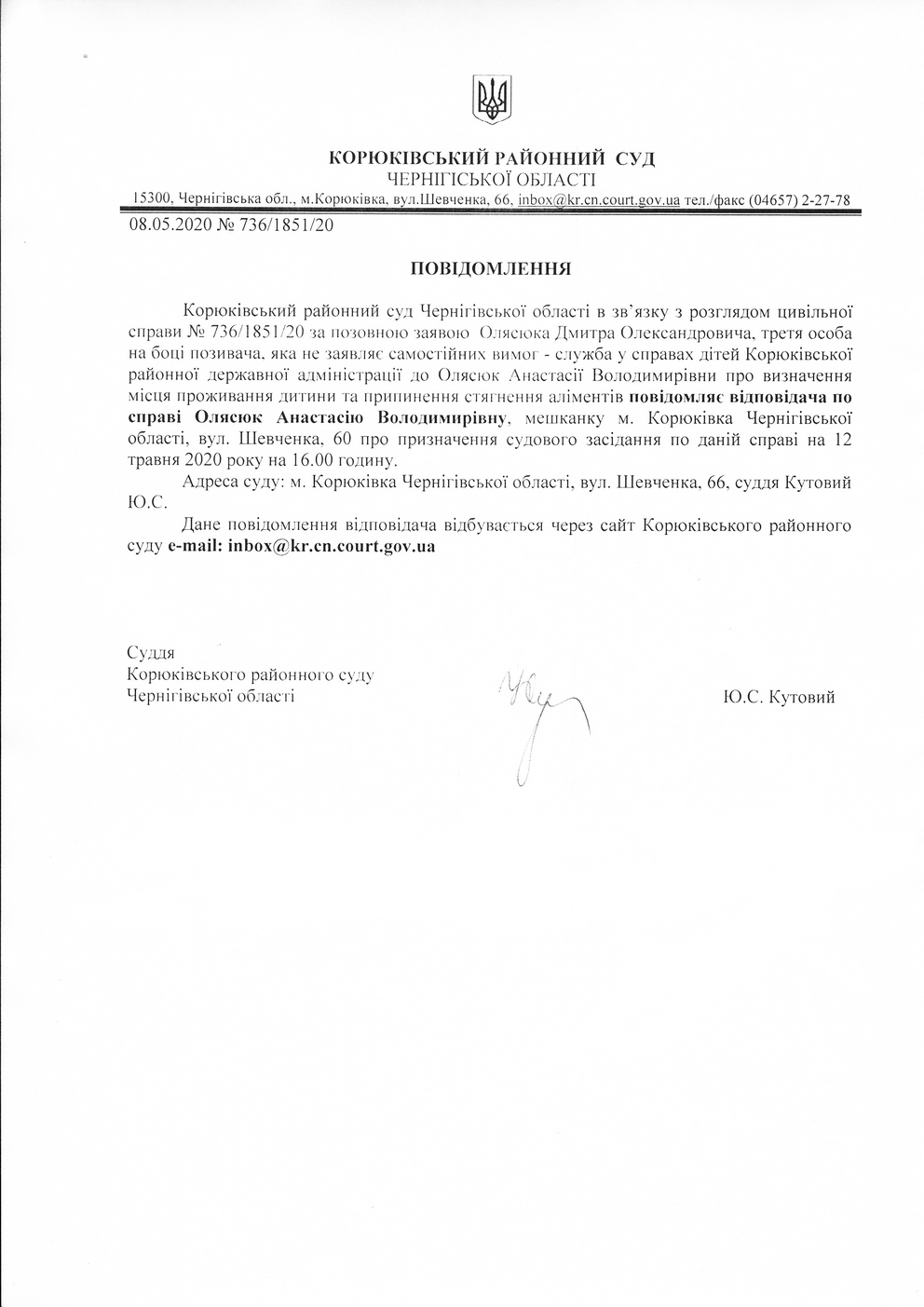 Повідомлення від 08.05.2020 про виклик до суду Олясюк Анастасію Володимирівну