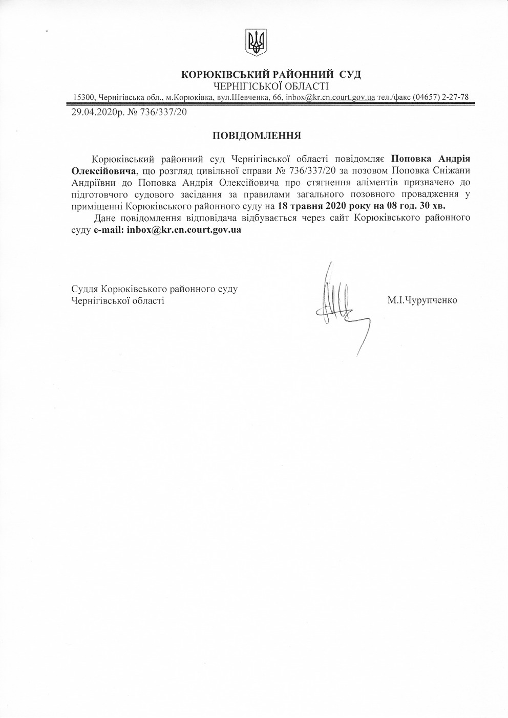 Повідомлення від 29.04.2020 про виклик до суду Поповка Андрія Олексійовича