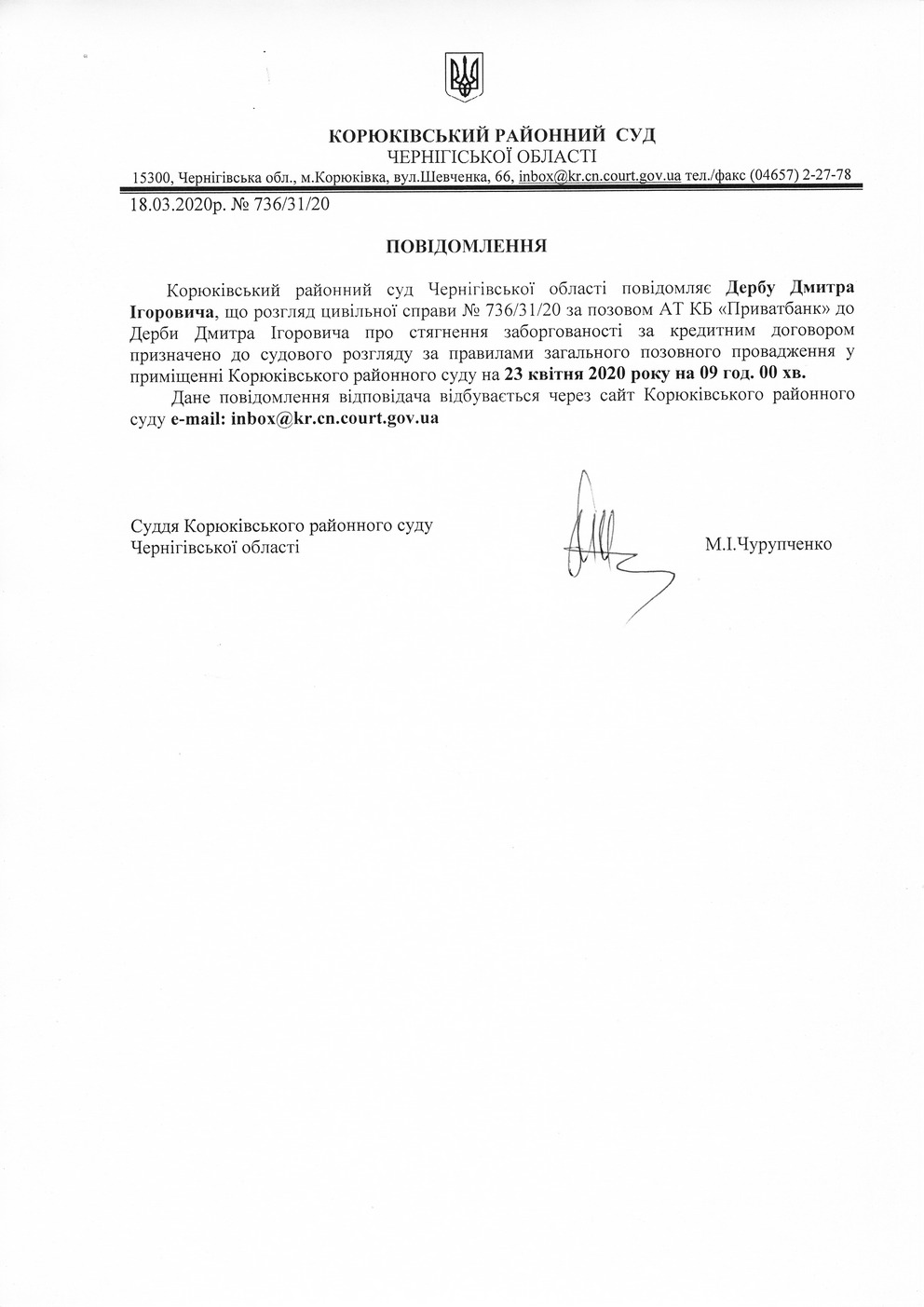 Повідомлення від 18.03.2020 про виклик до суду Дербу Дмитра Ігоровича