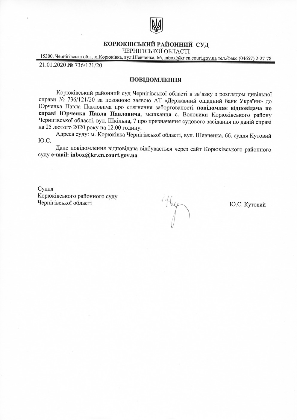 Повідомлення від 23.01.2020 про виклик до суду Юрченка Павла Павловича