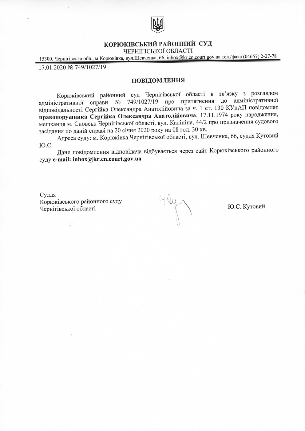 Повідомлення від 17.01.2020 про виклик до суду Сергійка Олександра Анатолійовича