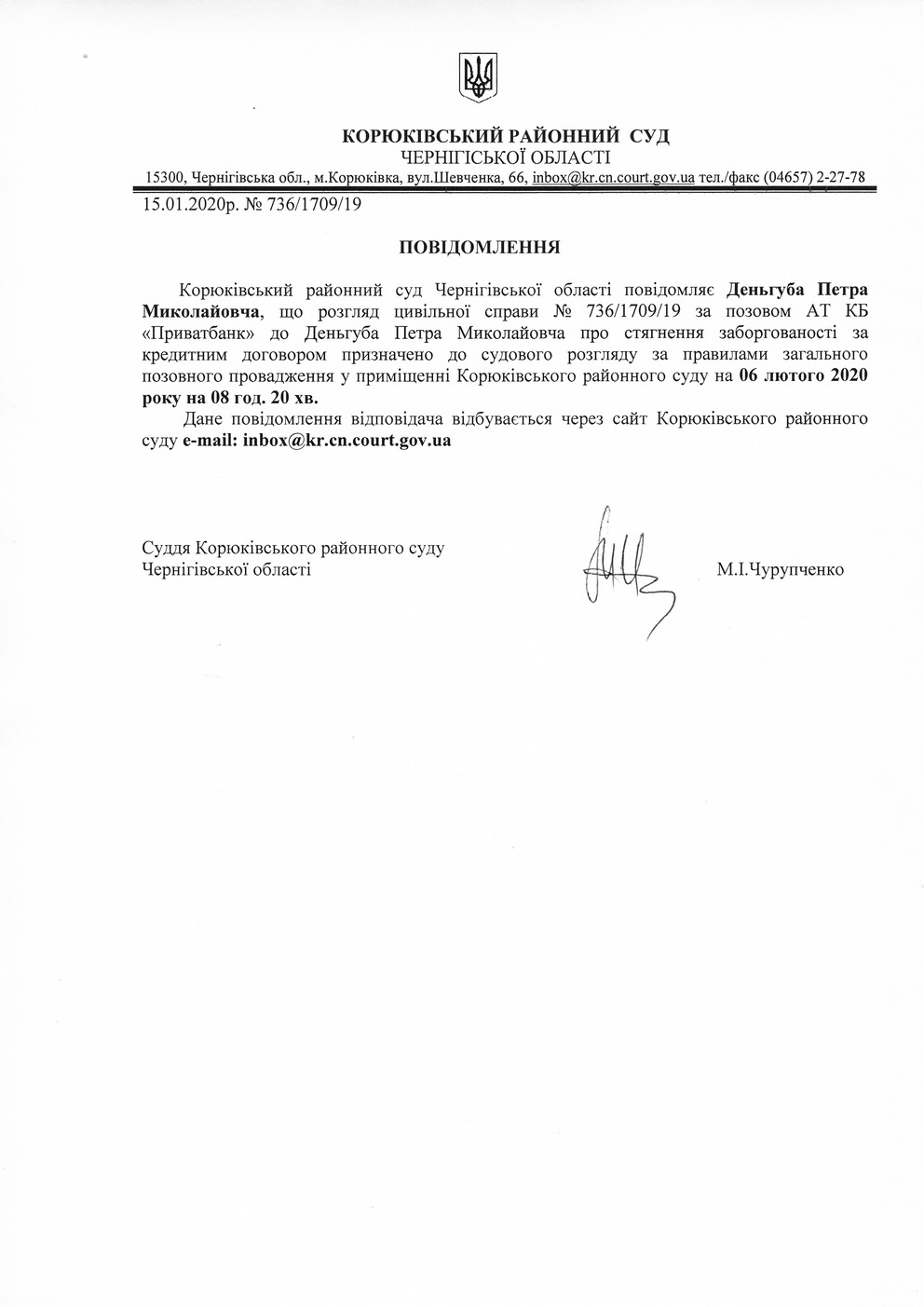 Повідомлення від 15.01.2020 про виклик до суду Деньгуба Петра Миколайовича