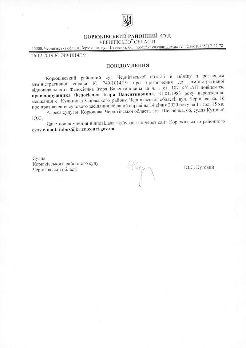 Повідомлення від 28.12.2019 про виклик до суду Федосієнка Ігоря Валентиновича