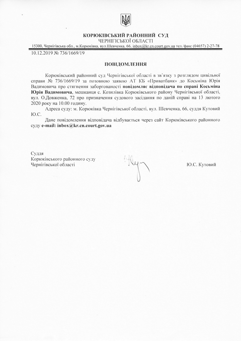 Повідомлення від 11.12.2019 про виклик до суду Косьміна Юрія Вадимовича