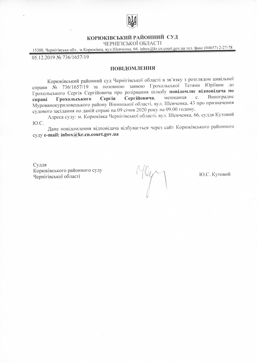 Повідомлення від 05.12.2019 про виклик до суду Грохольського Сергія Сергійовича