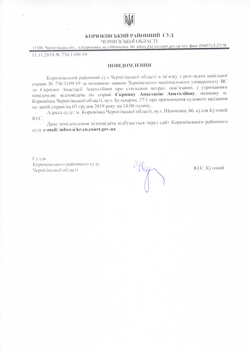 Повідомлення від 11.11.2019 про виклик до суду Скрипку Анастасію Анатоліївну