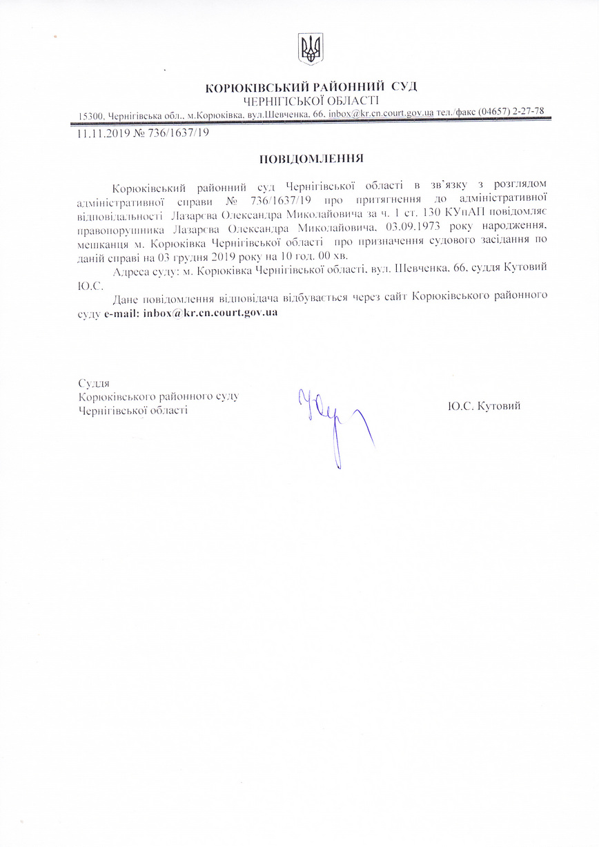 Повідомлення від 11.11.2019 про виклик до суду Лазарєва Олександра Миколайовича