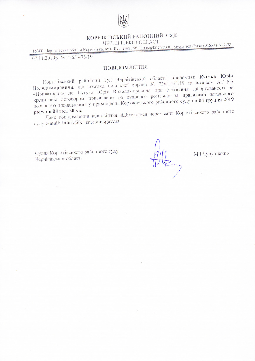 Повідомлення від 07.11.2019 про виклик до суду Кугука Юрія Володимировича