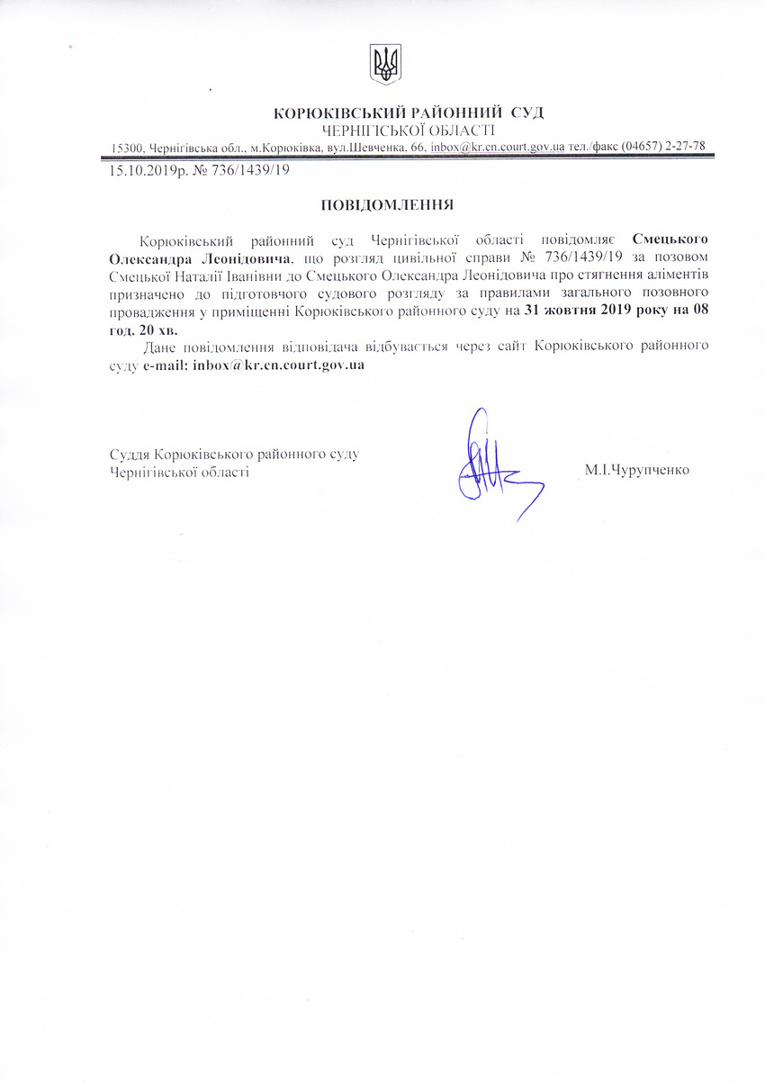 Повідомлення від 15.10.2019 про виклик до суду Смецького Олександра Леонідовича