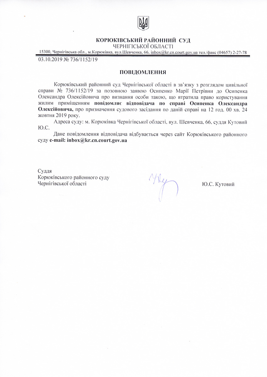Повідомлення від 03.10.2019 про виклик до суду Осипенка Олександра Олексійовича