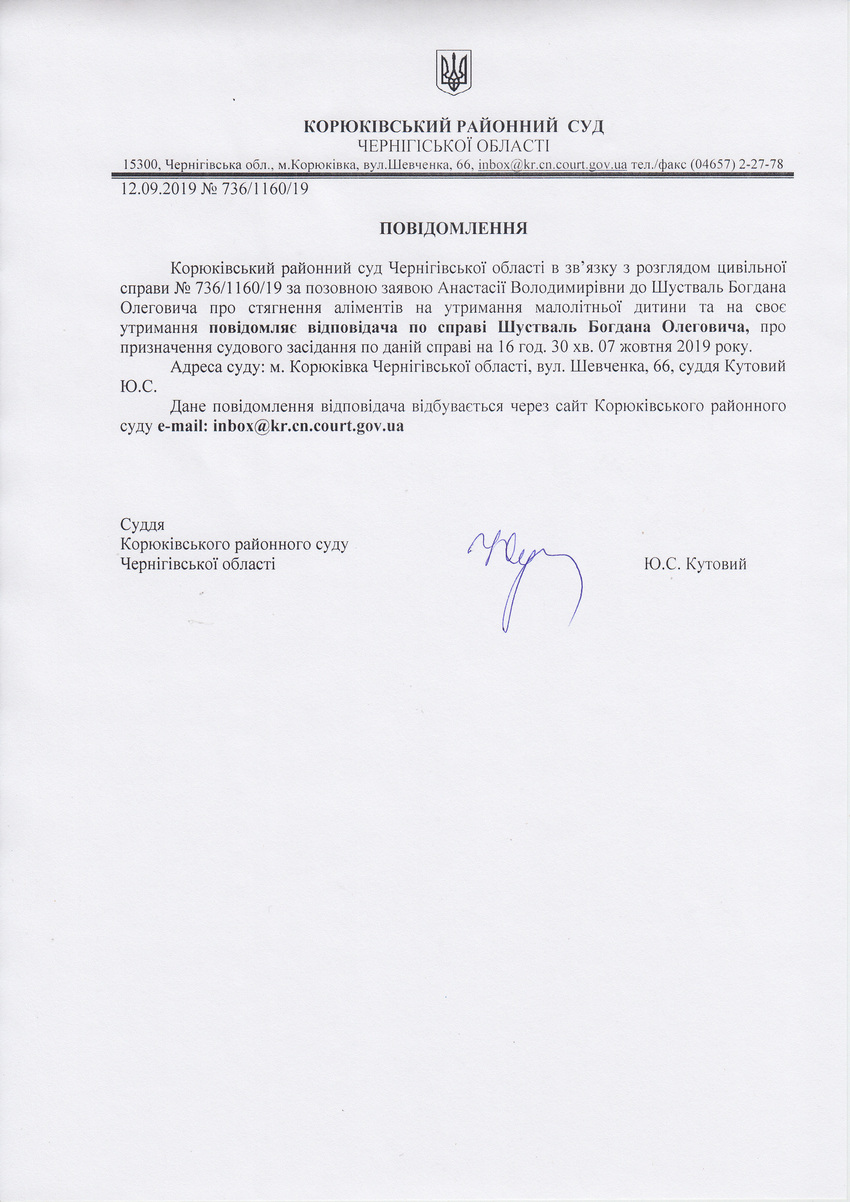 Повідомлення від 12.09.2019 про виклик до суду Шустваль Богдана Олеговича