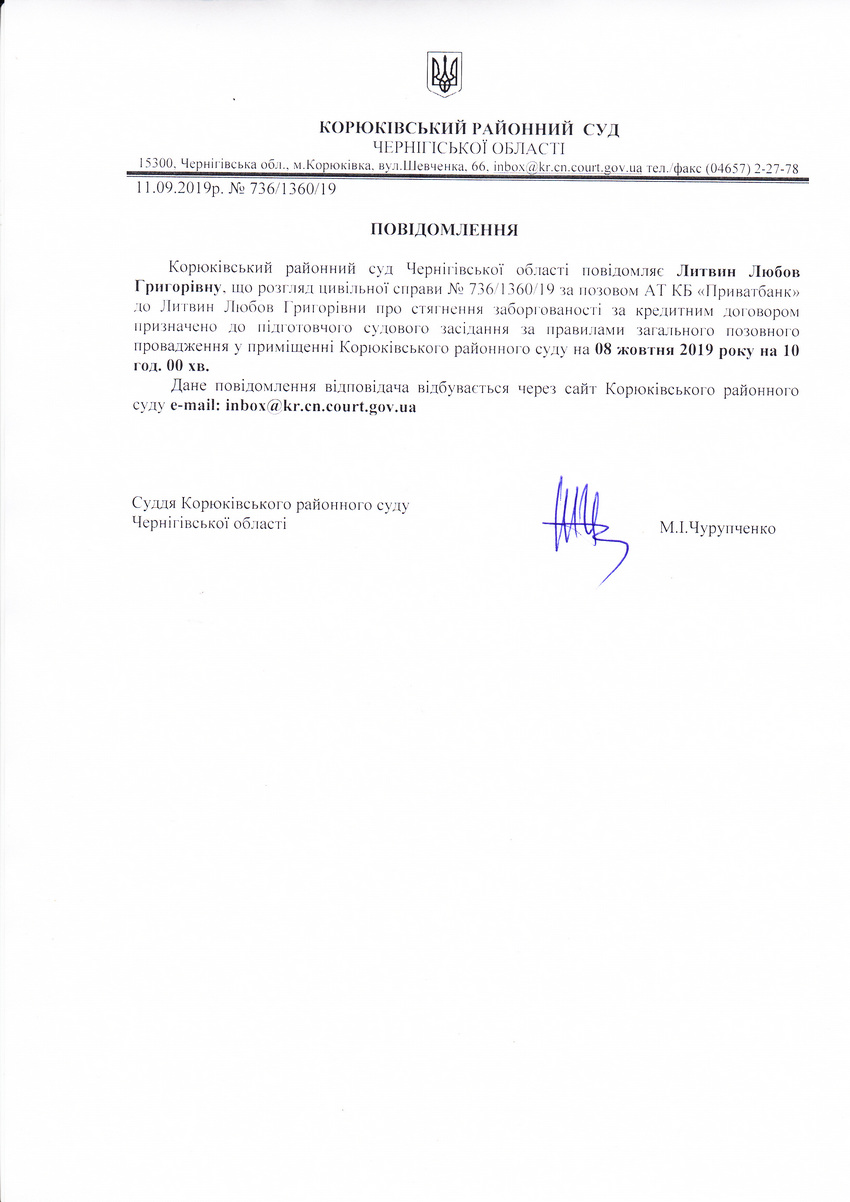 Повідомлення від 11.09.2019 про виклик до суду Литвин Любов Григорівну