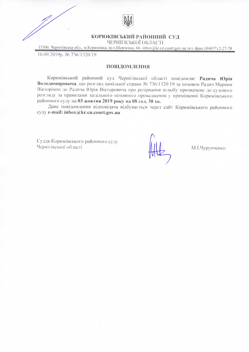 Повідомлення від 10.09.2019 про виклик до суду Радича Юрія Володимировича