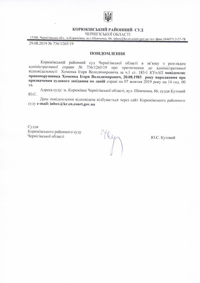 Повідомлення від 02.09.2019 про виклик до суду Хоменка Ігоря Володимировича