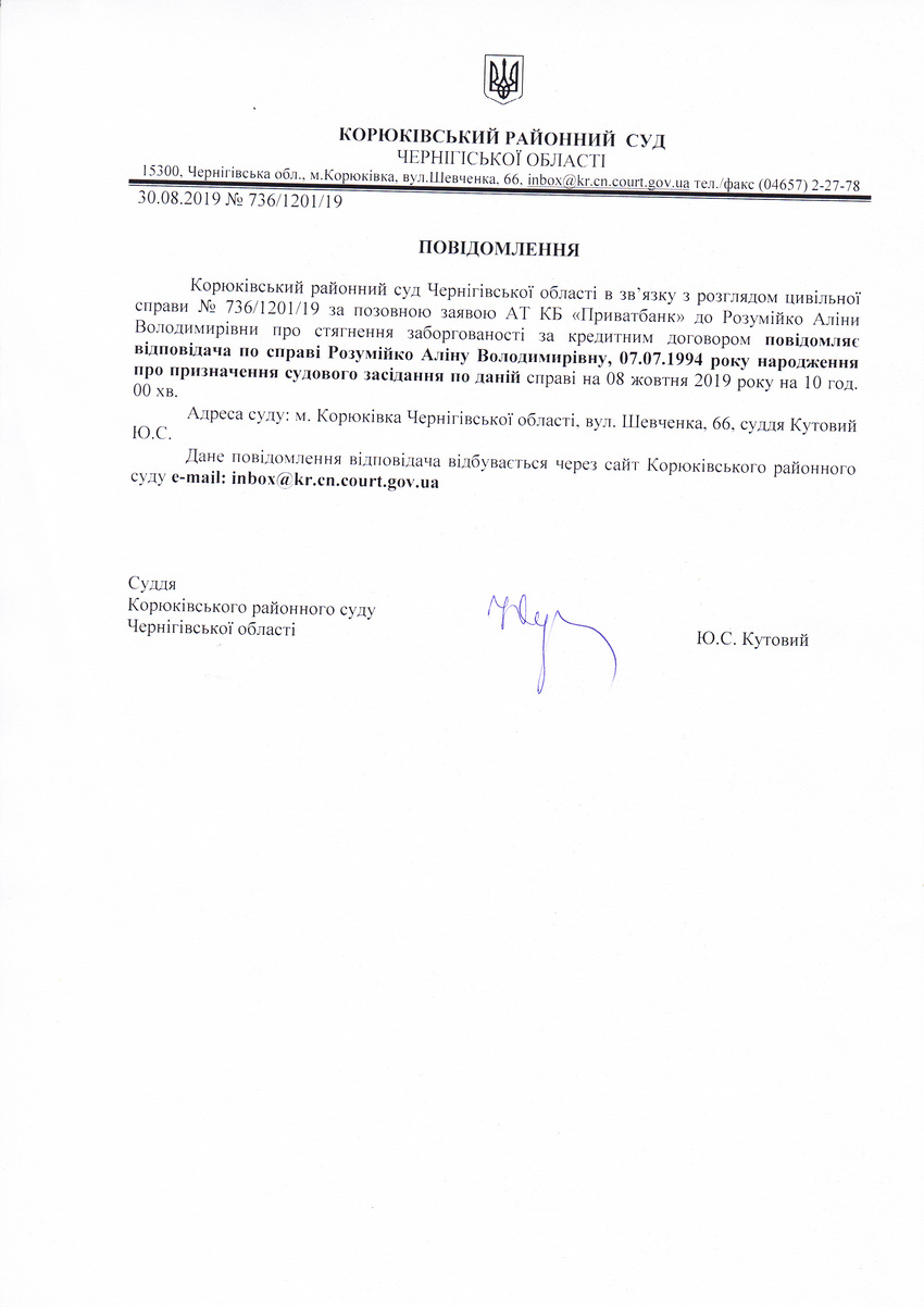 Повідомлення від 02.09.2019 про виклик до суду Розумійко Аліну Володимирівну