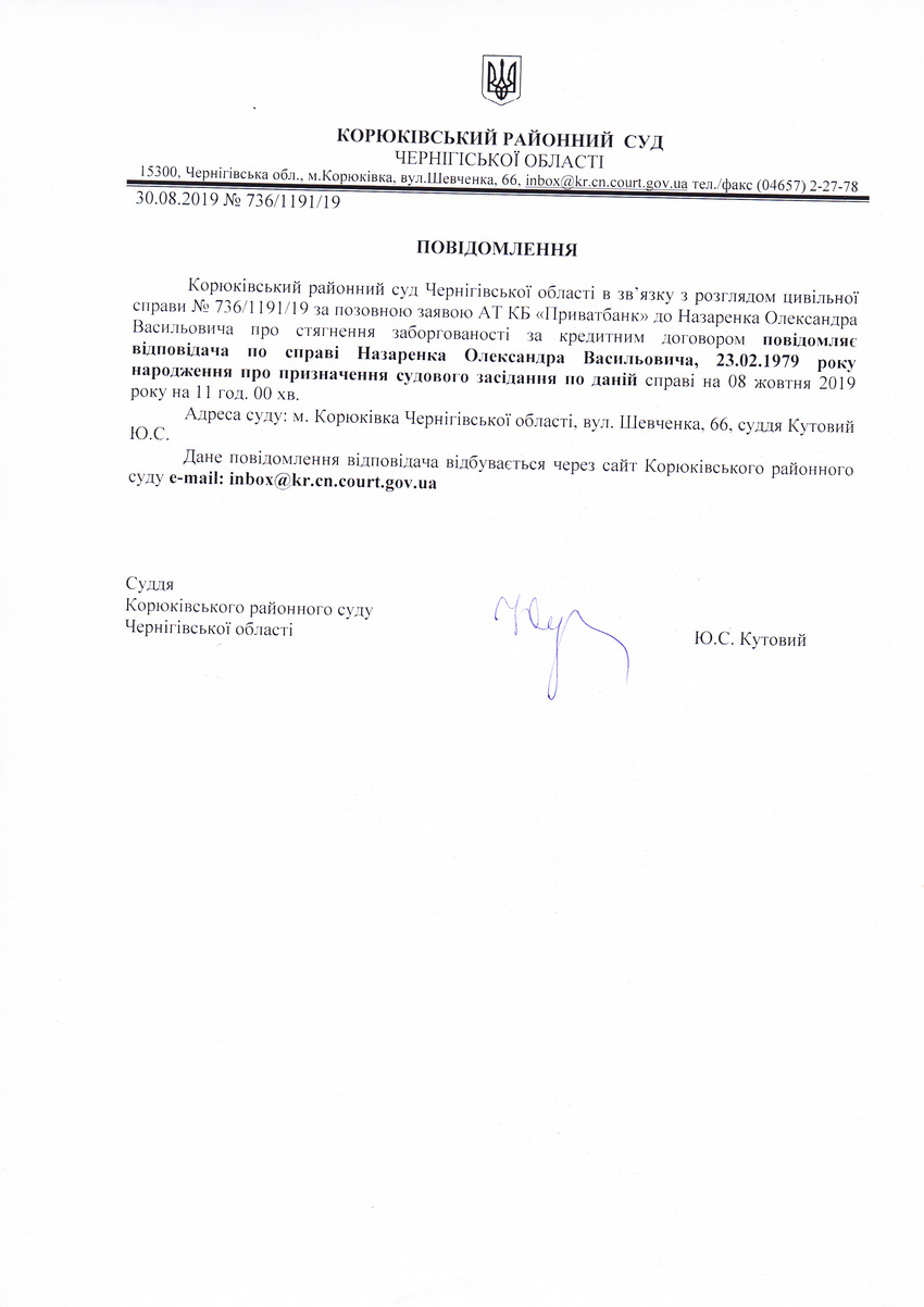 Повідомлення від 02.09.2019 про виклик до суду Назаренка Олександра Васильовича