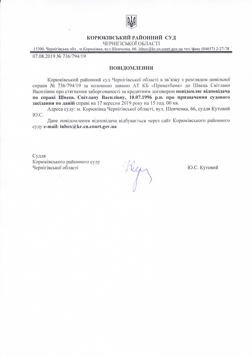 Повідомлення від 07.08.2019 про виклик до суду Швець Світлану Василівну