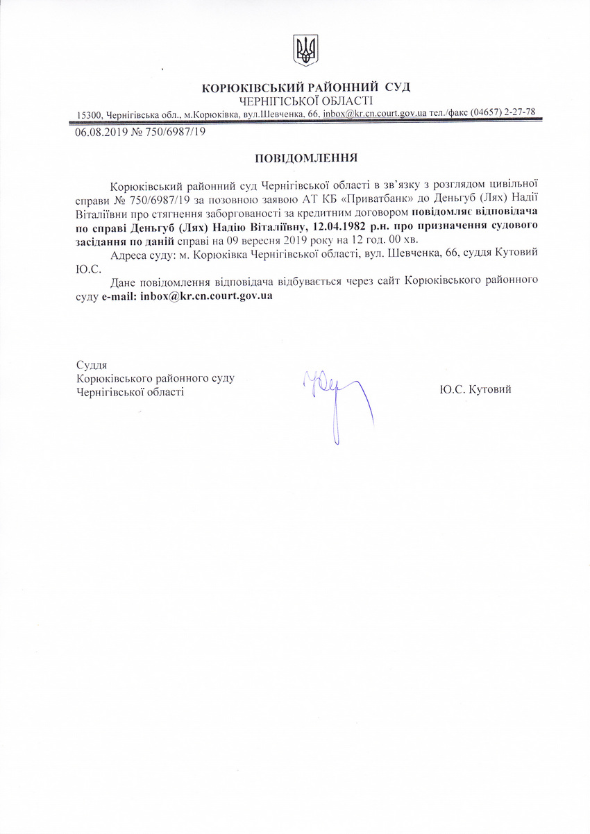 Повідомлення від 07.08.2019 про виклик до суду Деньгуб (Лях) Надію Віталіївну