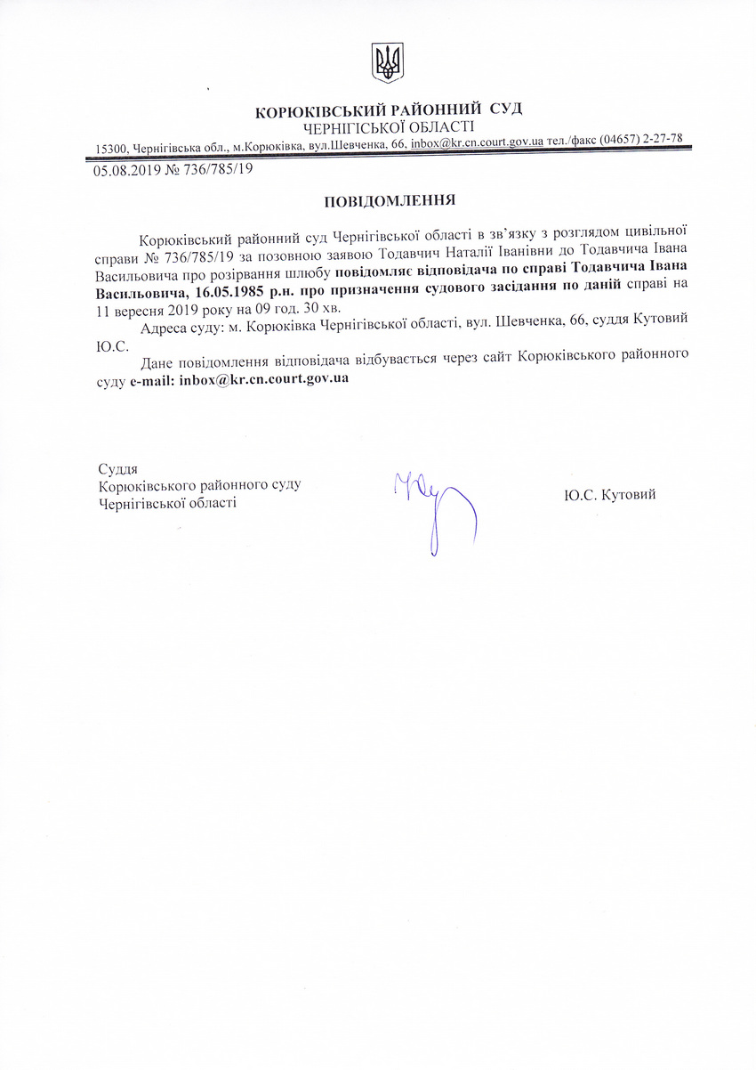 Повідомлення від 05.08.2019 про виклик до суду Тодавчича Івана Васильовича