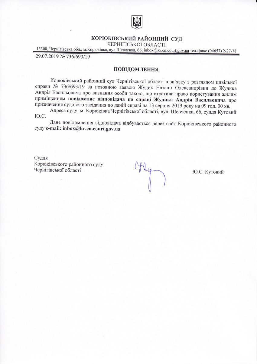 Повідомлення від 29.07.2019 про виклик до суду Жудика Андрія Васильовича