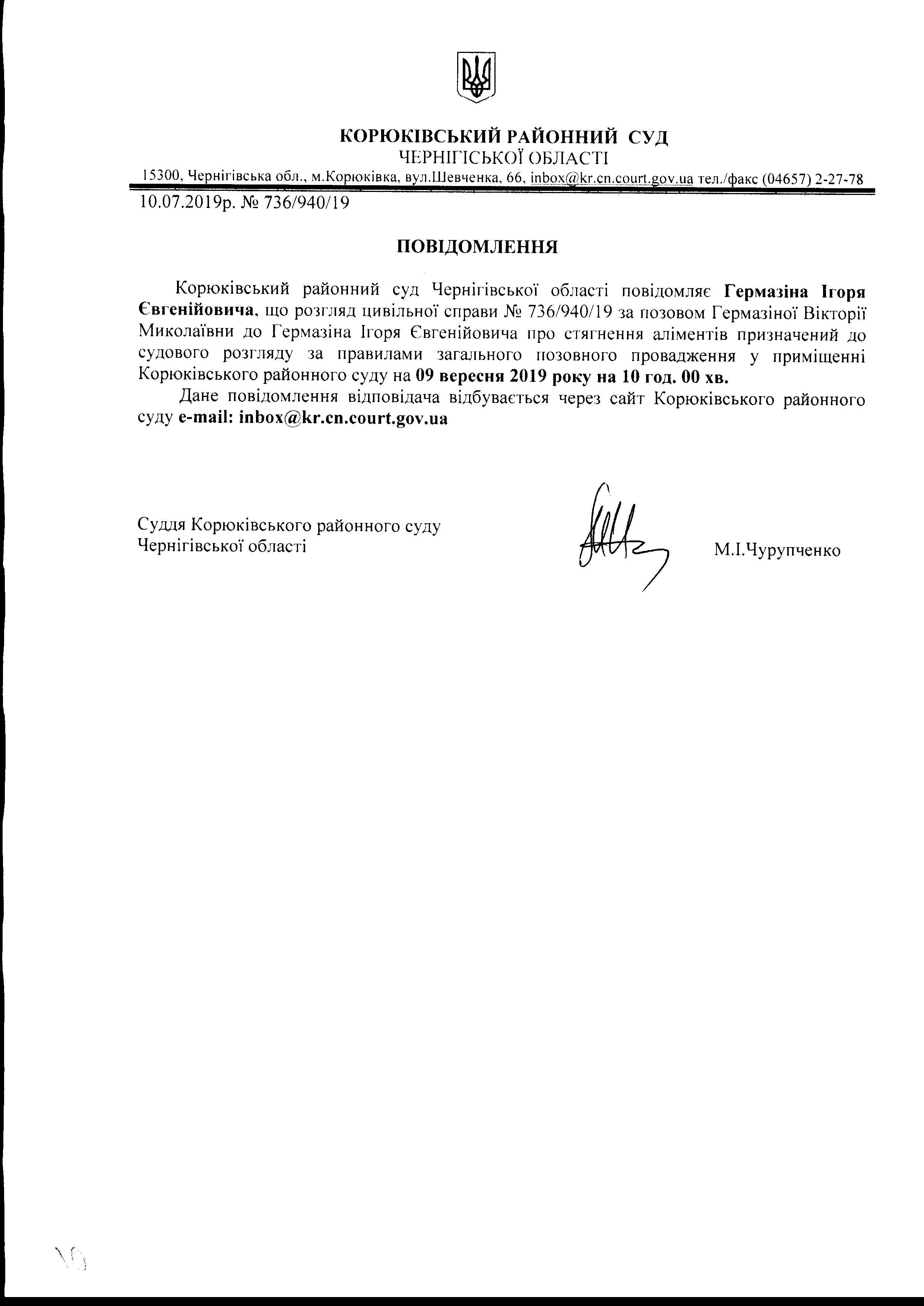 Повідомлення від 10.07.2019 про виклик до суду Гермазіна Ігоря Євгенійовича