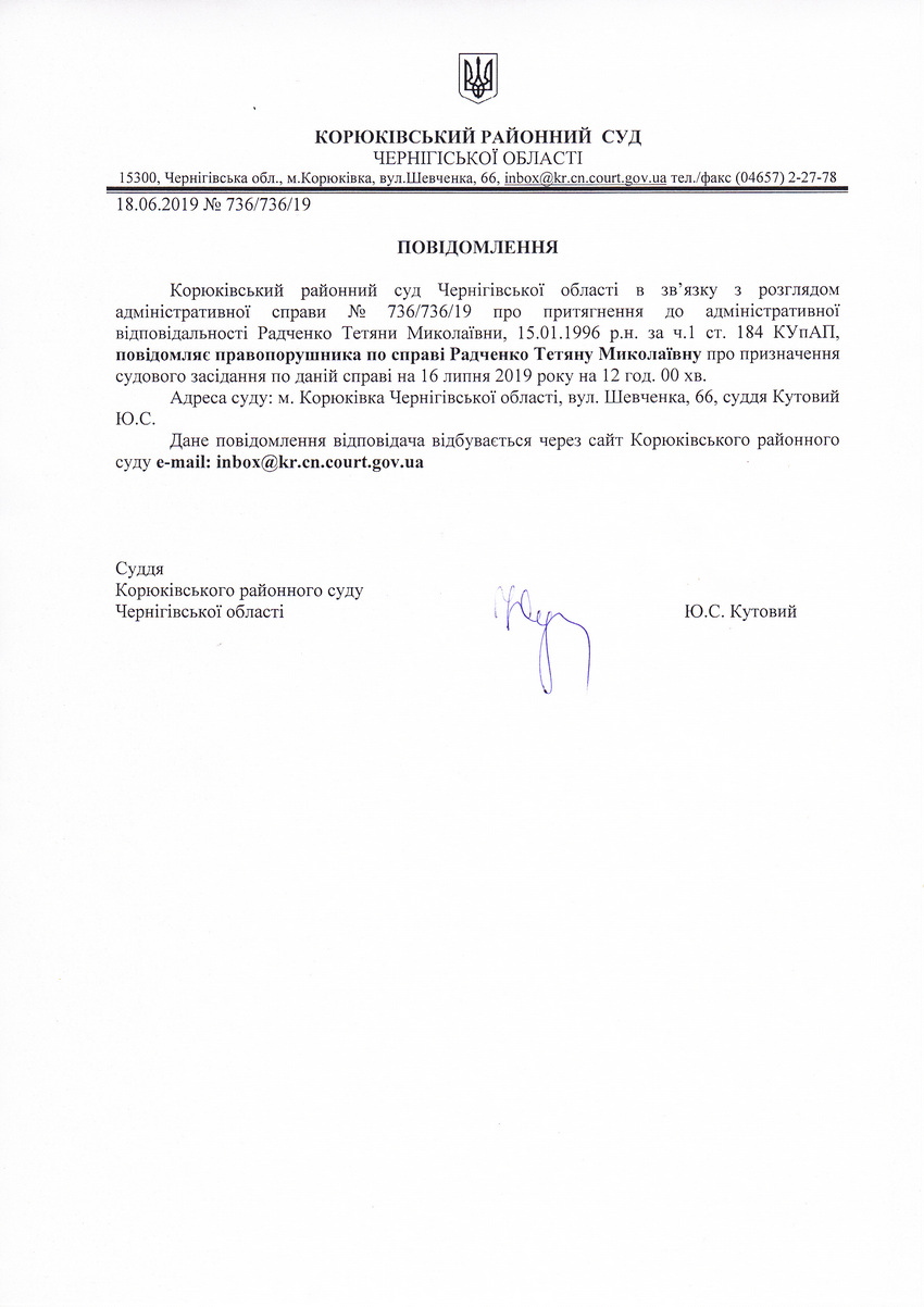 Повідомлення від 18.06.2019 про виклик до суду Радченко Тетяну Миколаївну
