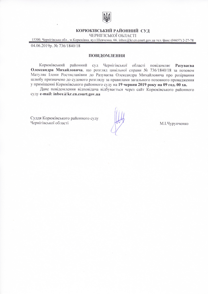 Повідомлення від 04.06.2019 про виклик до суду Разуваєва Олександра Михайловича