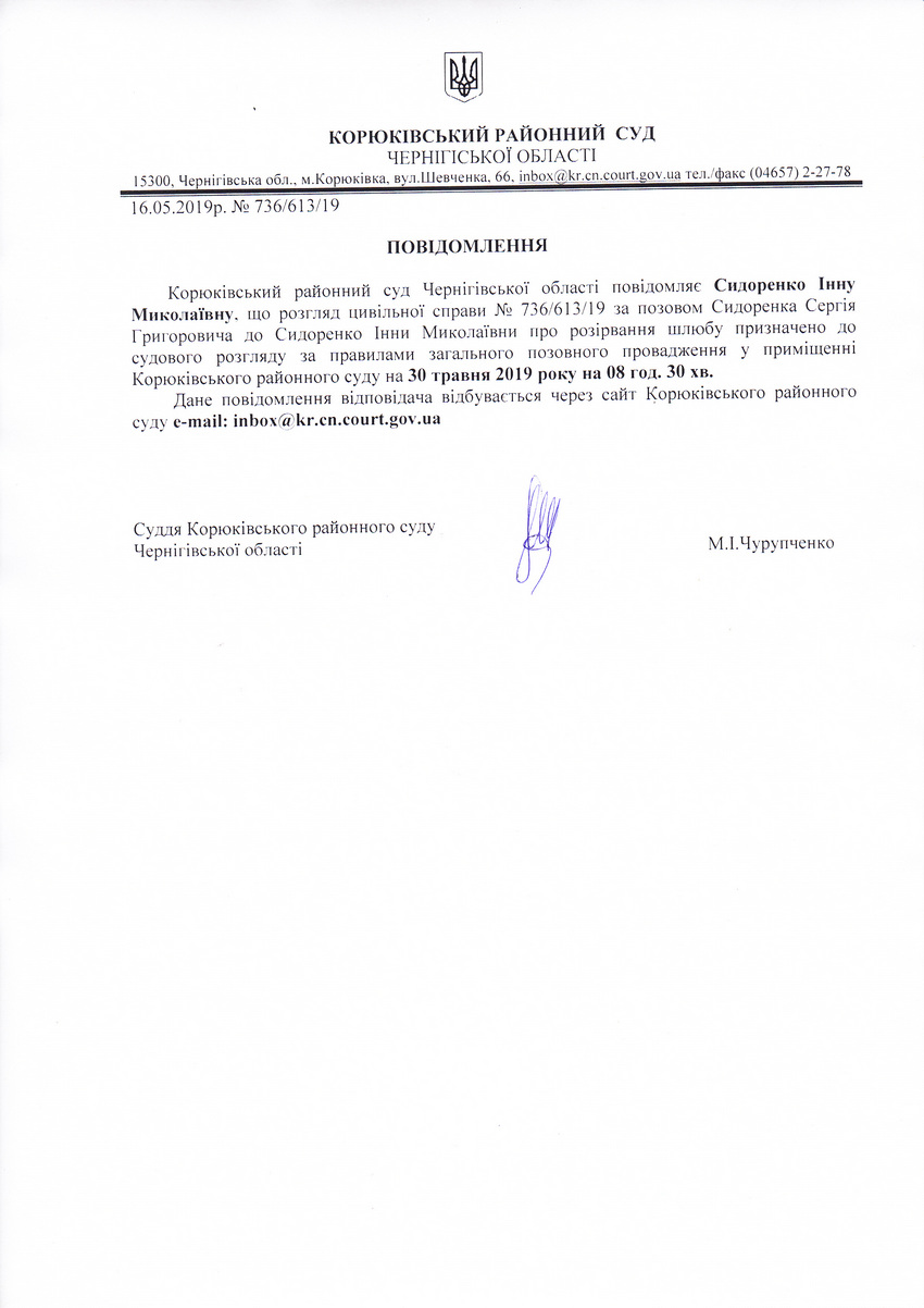 Повідомлення від 16.05.2019 про виклик до суду Сидоренко Інну Миколаївну