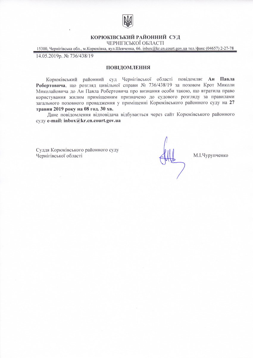 Повідомлення від 14.05.2019 про виклик до суду Ан Павла Робертовича
