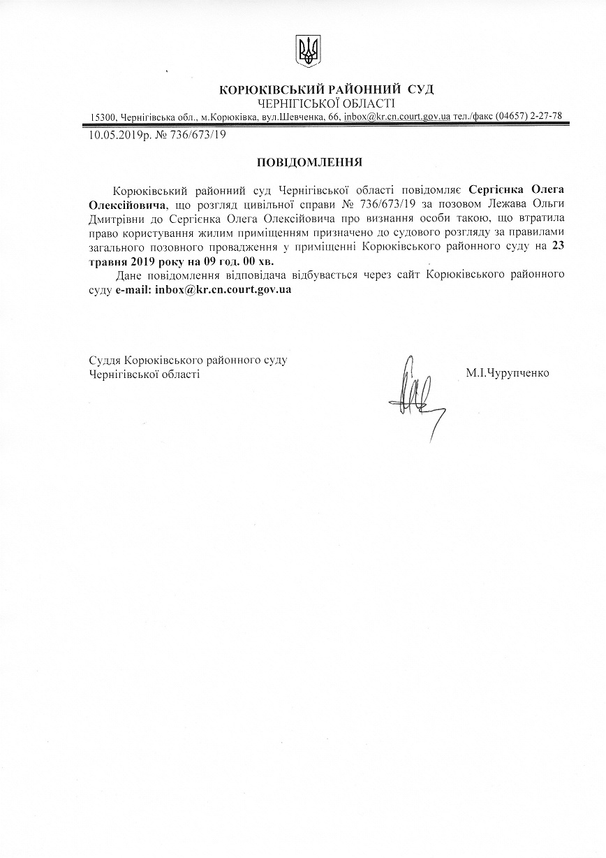 Повідомлення від 11.05.2019 про виклик до суду Сергієнка Олега Олексійовича
