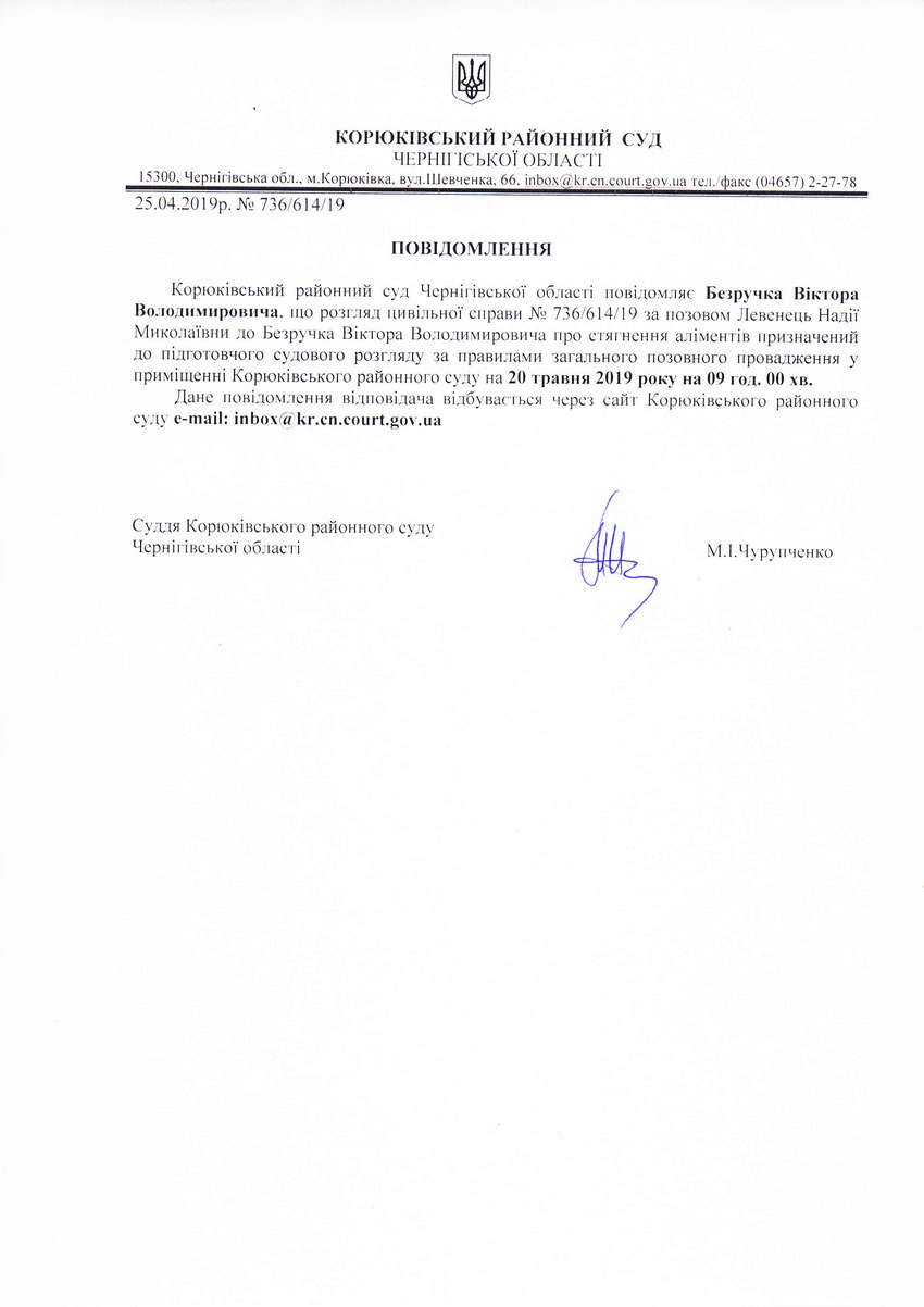 Повідомлення від 26.04.2019 про виклик до суду Безручка Віктора Володимировича
