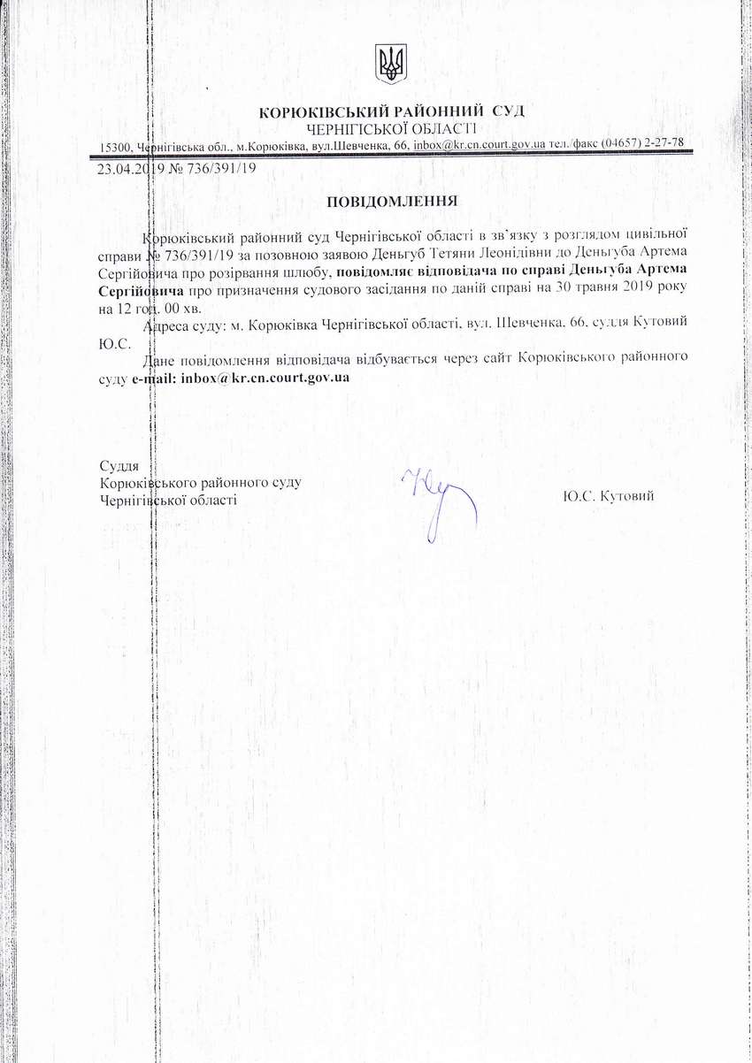 Повідомлення від 23.04.2019 про виклик до суду Деньгуба Артема Сергійовича