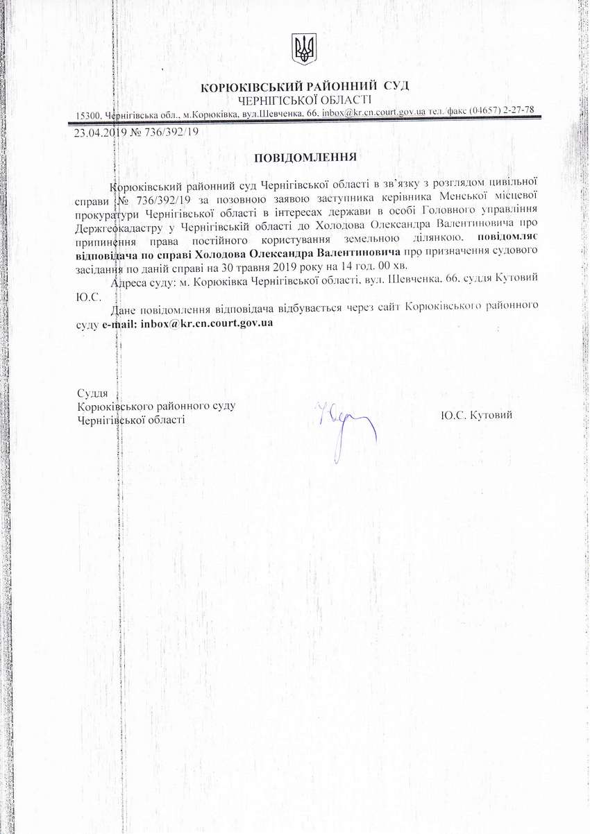 Повідомлення від 23.04.2019 про виклик до суду Холодова Олександра Валентиновича