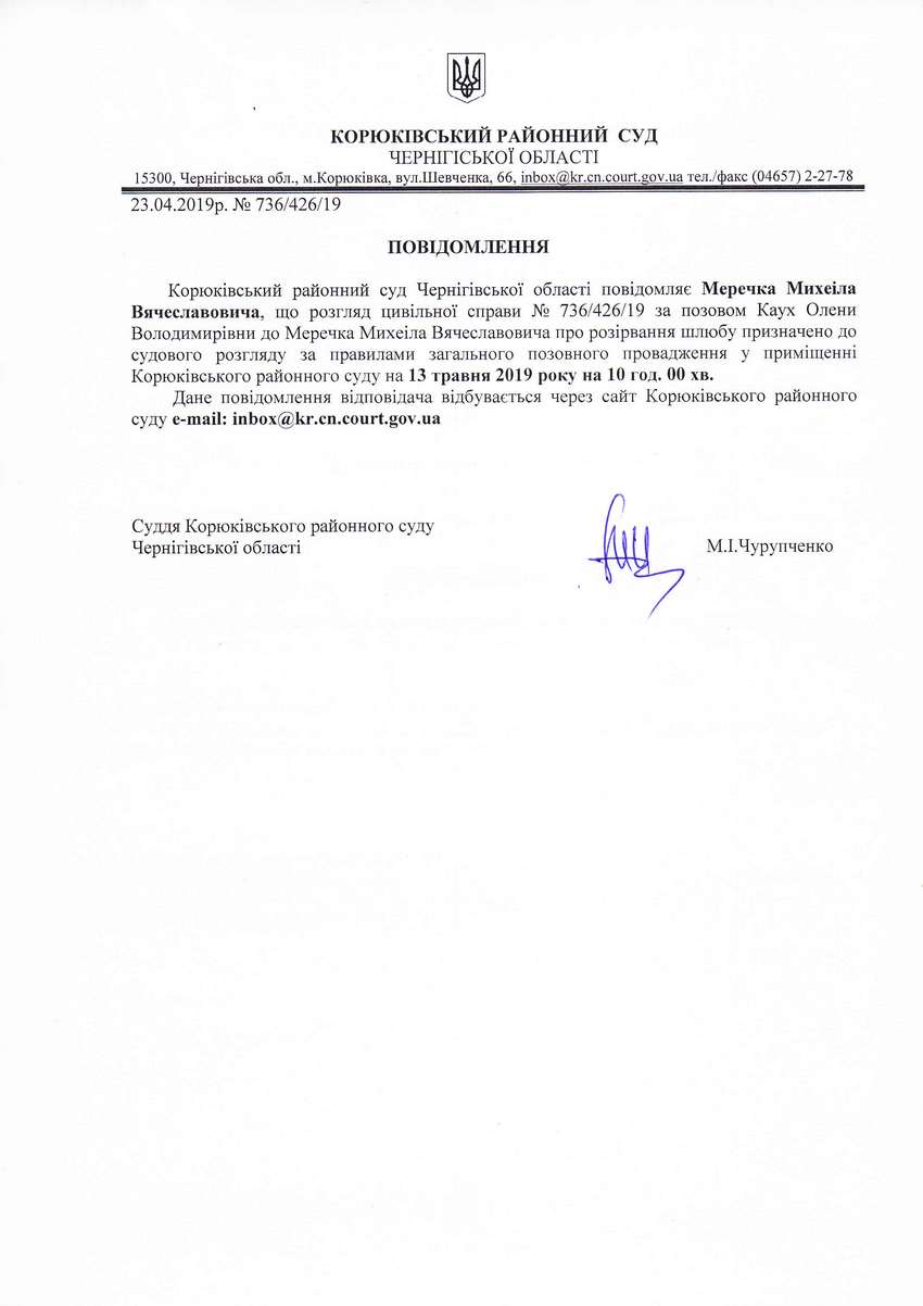 Повідомлення від 23.04.2019 про виклик до суду Меречка Михеіла Вячеславовича