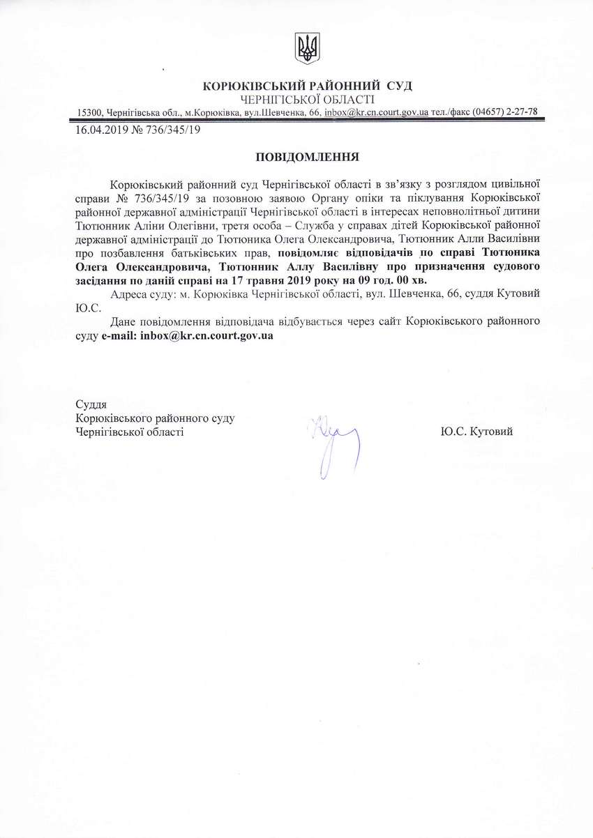 Повідомлення від 16.04.2019 про виклик до суду Тютюника Олега Олександровича, Тютюнник Аллу Василівну