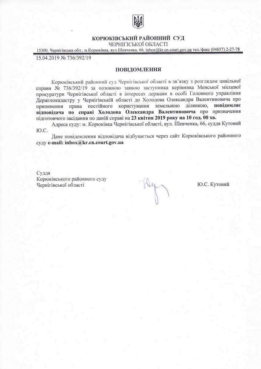 Повідомлення від 15.04.2019 про виклик до суду Холодова Олександра Валентиновича