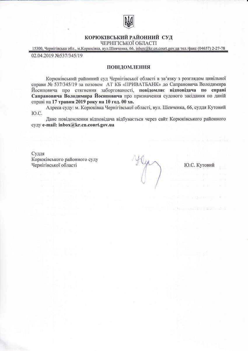 Повідомлення від 02.04.2019 про виклик до суду Сапрановича Володимира Йосиповича