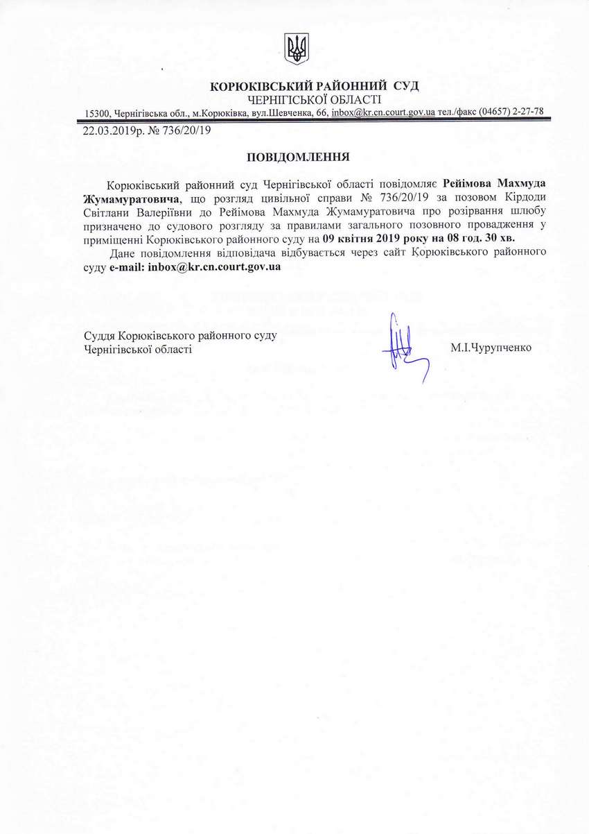 Повідомлення від 22.03.2019 про виклик до суду Рейімова Махмуда Жумамуратовича