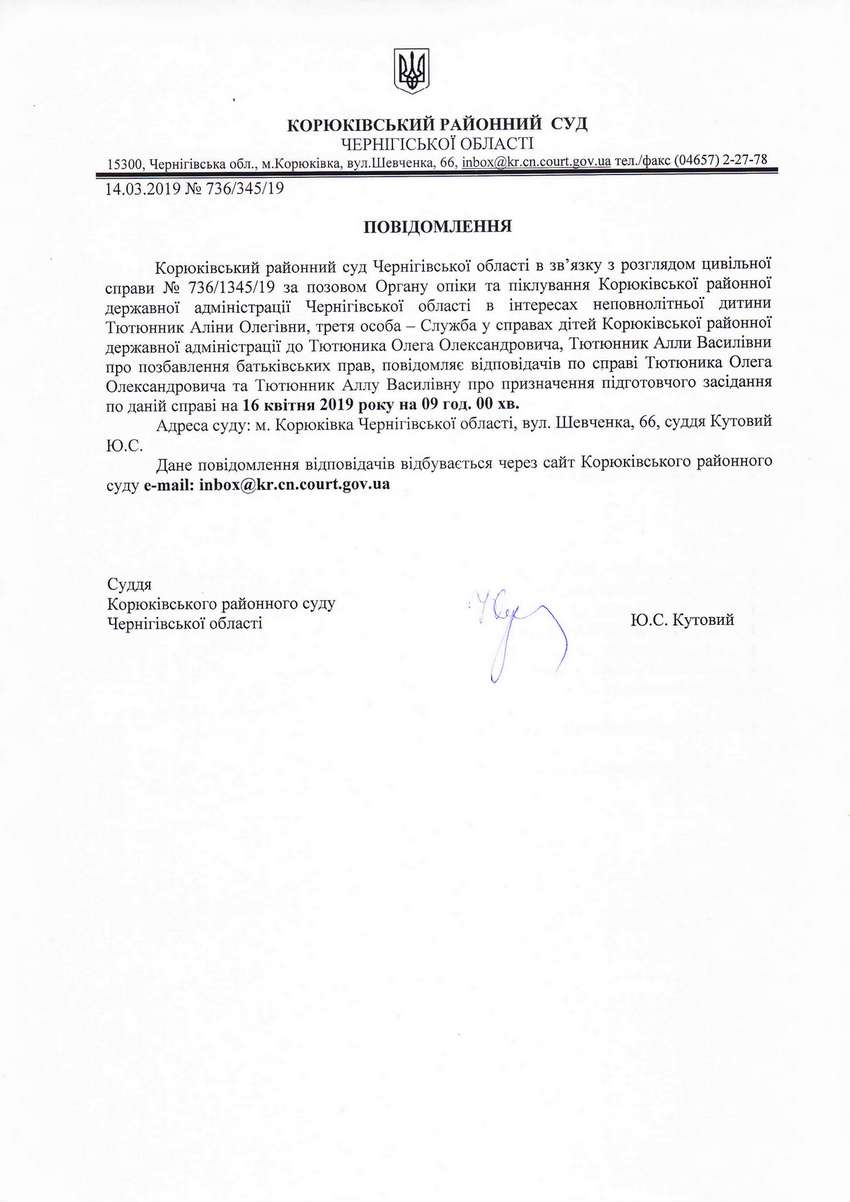 Повідомлення від 14.03.2019 про виклик до суду Тютюнник Олега Олександровича та Тютюнник Аллу Василывну