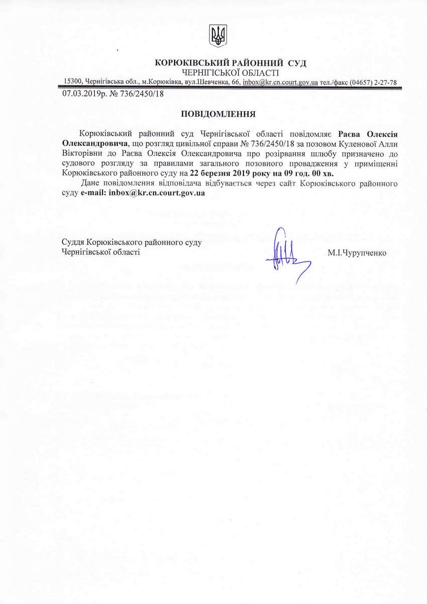 Повідомлення від 07.03.2019 про виклик до суду Раєва Олексія Олександровича