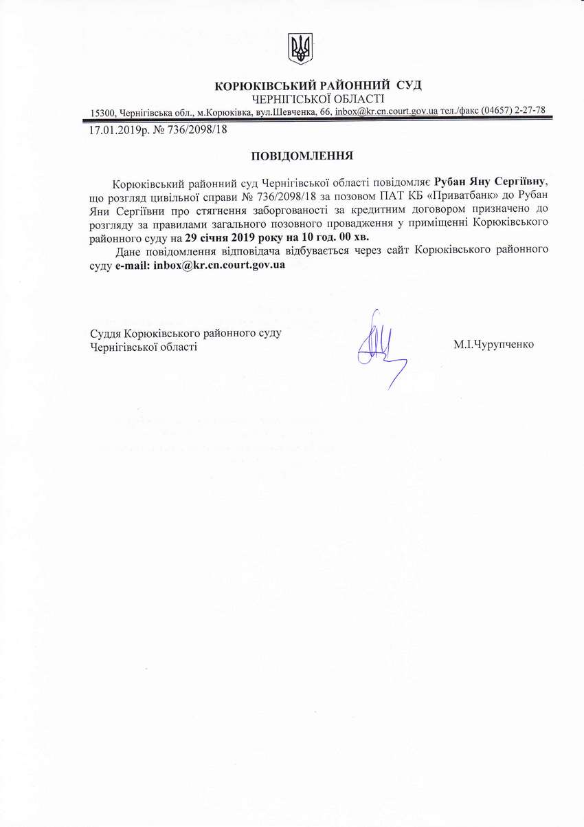 Повідомлення від 17.01.2019 про виклик до суду Рубан Яну Сергіївну