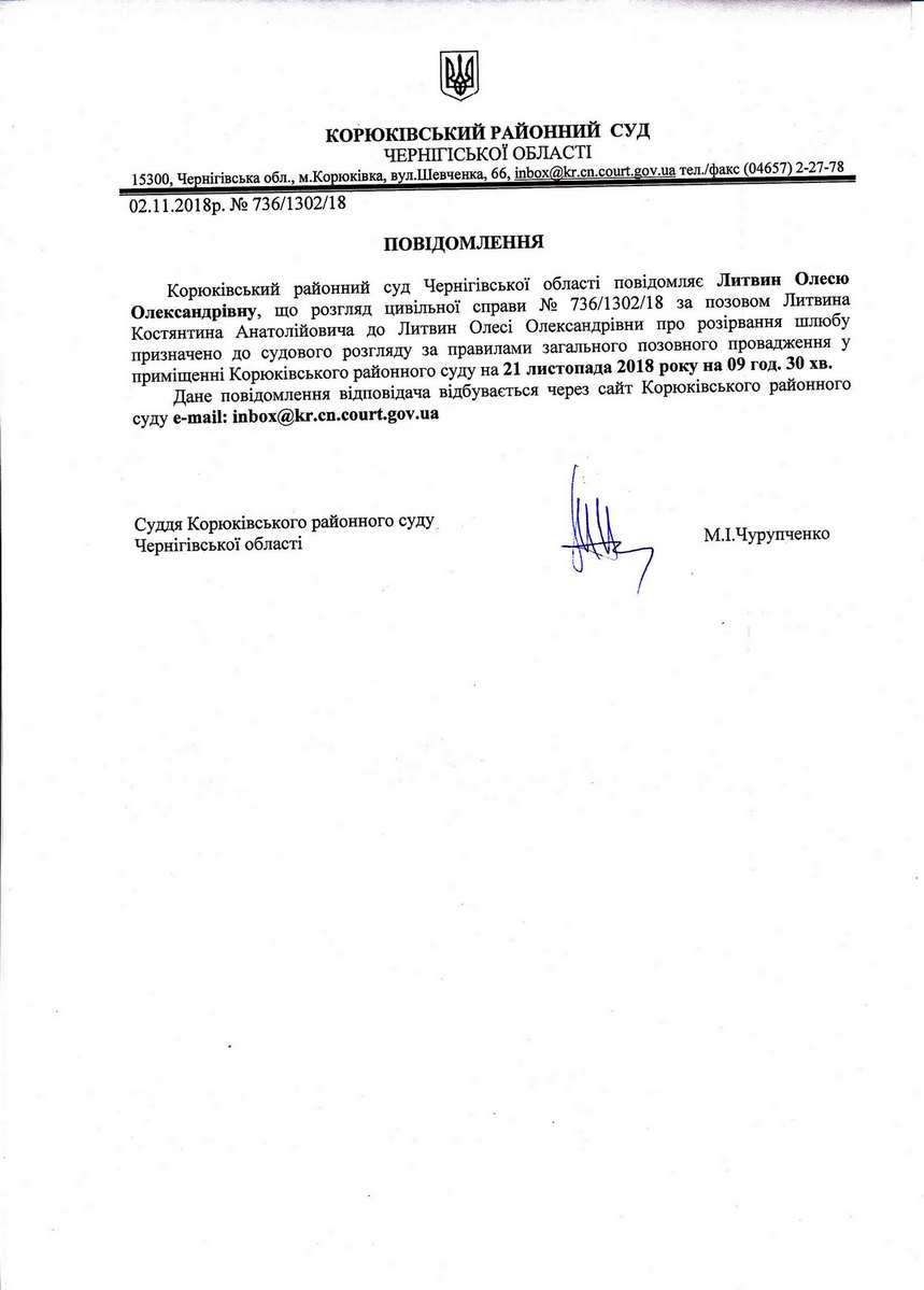 Повідомлення від 05.11.2018 про виклик до суду Литвин Олесю Олександрівну