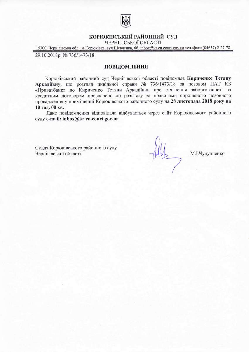 Повідомлення від 29.10.2018 про виклик до суду Кириченко Тетяну Аркадіївну