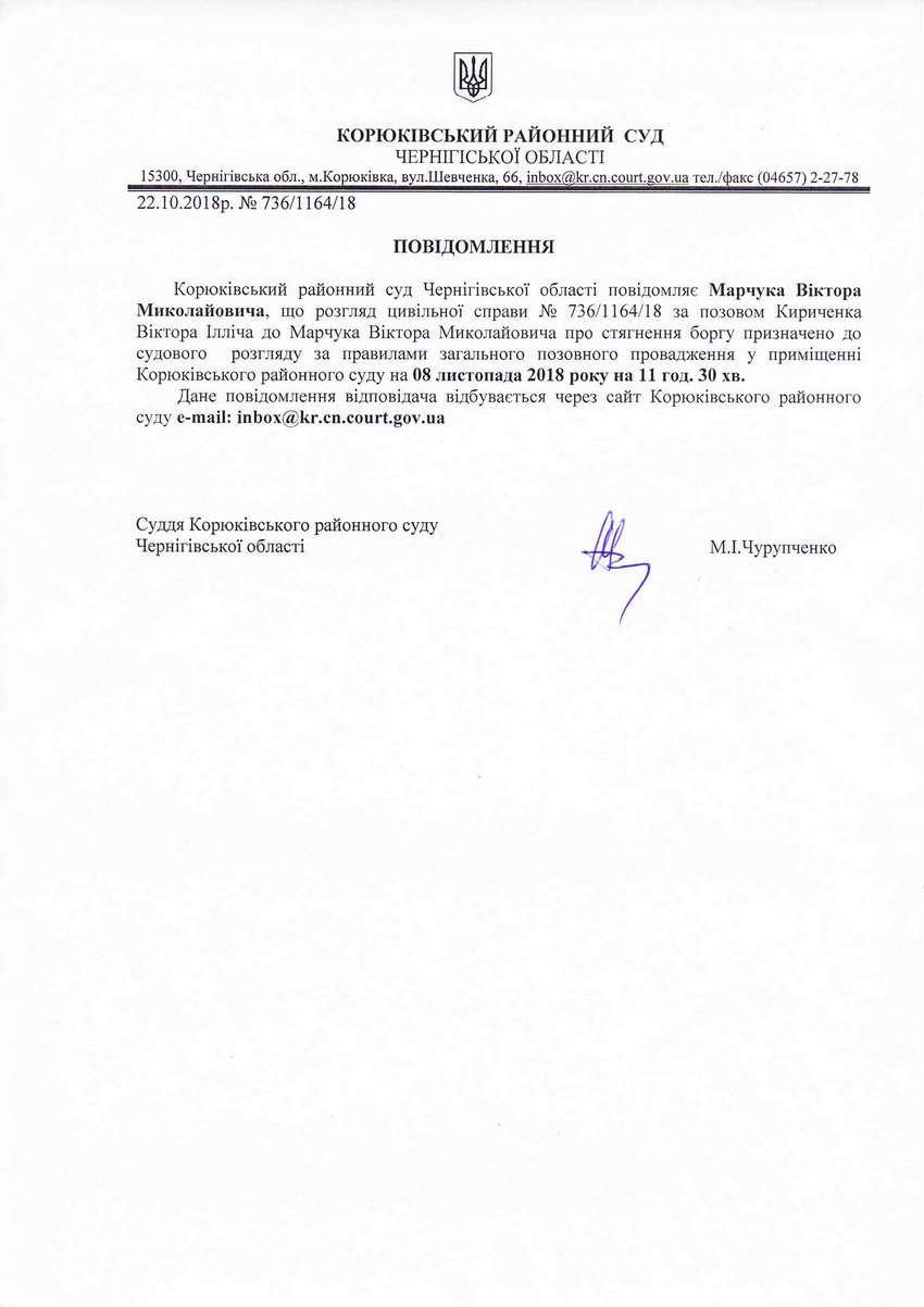 Повідомлення від 22.10.2018 про виклик до суду Марчука Віктора Миколайовича