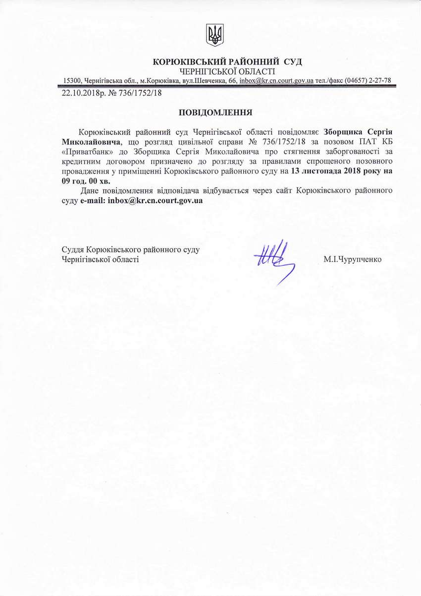 Повідомлення від 22.10.2018 про виклик до суду Зобрщика Сергія Миколайовича
